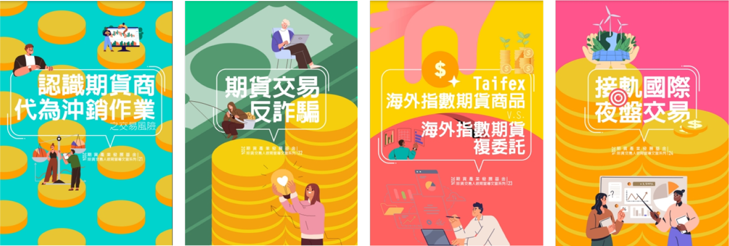 主軸分別文-「認識期貨商代為沖銷作業之交易風險」、「期貨交易反詐騙」、「Taifex海外指數期貨商品vs海外指數期貨複委託」、「接軌國際夜盤交易」。