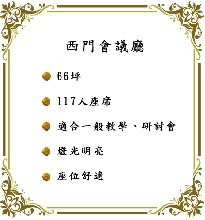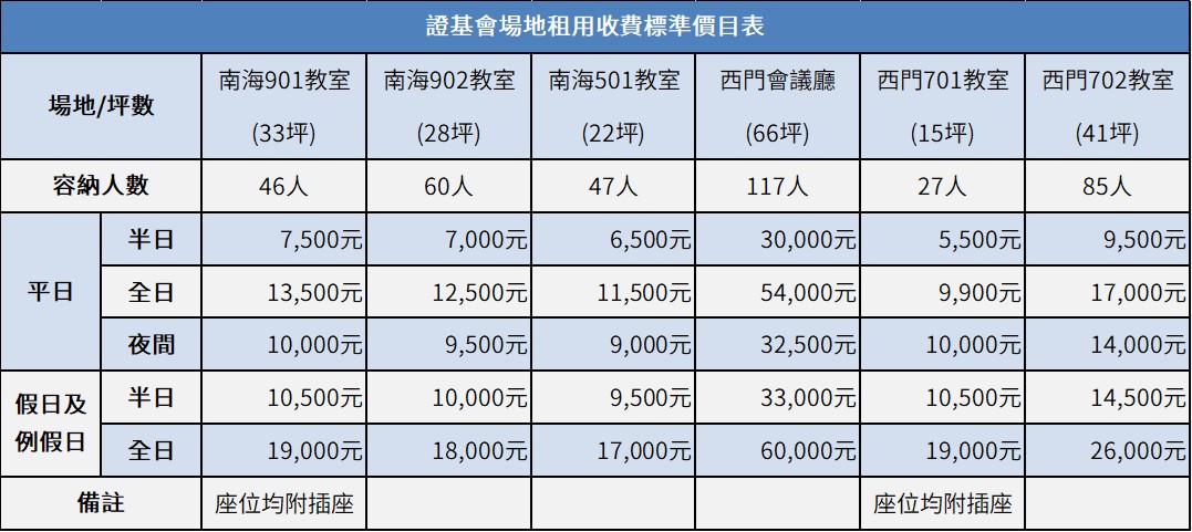 (一) | 收費含免費提供無線麥克風2支、報到桌、茶水等服務;並備有教師休息室及學員休息區供使用。